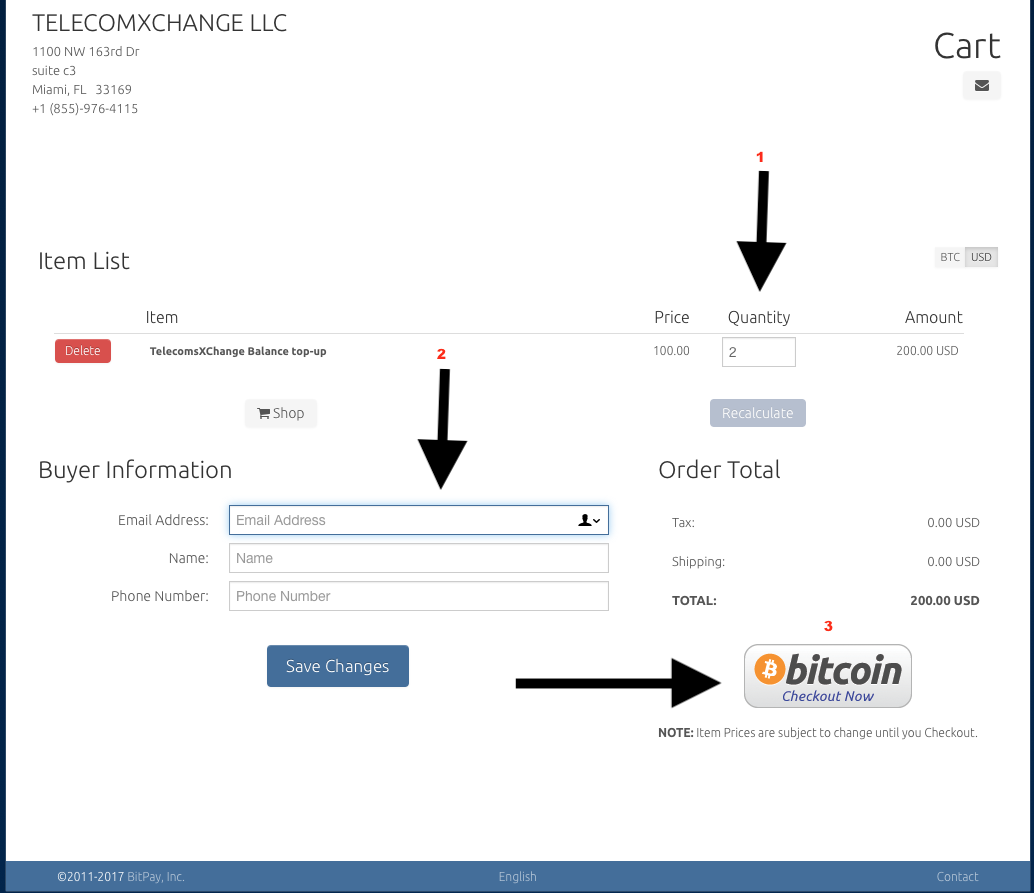 - Click on this payment page to send BTC (bitcoins) to TelecomsXChange ( Pay with BTC)